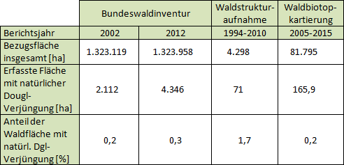 Tab. 1: Vorkommen von Douglasien-Naturverjüngung in Baden-Württemberg gemäß den drei ausgewerteten Inventursystemen; die Zahlen der Bundeswaldinventur und Waldstrukturaufnahme sind entsprechend der Repräsentationsfläche der Probeflächen hochgerechnet.