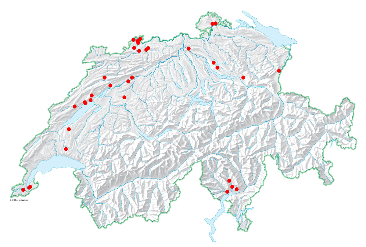 Abb. 2 - Verbreitungsdaten der Russrindenkrankheit nach Waldschutz Schweiz. Stand: 2021