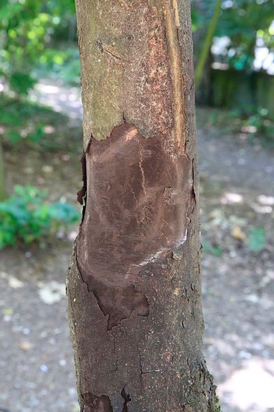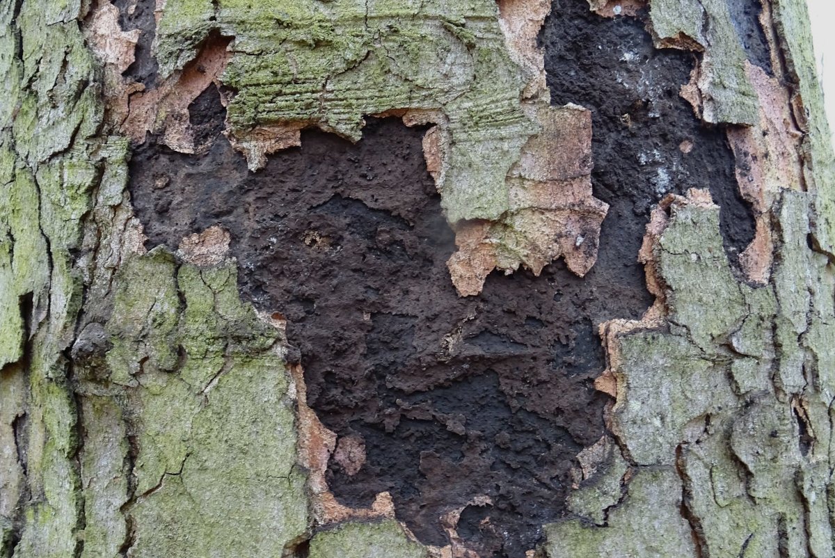 Später sterben Teile der Rinde und des darunterliegenden Gewebes ab (Nekrose, Abb. 1) und Baumsaft tritt aus (Schleimfluss). Es entstehen immer mehr Rindenrisse und die absterbenden Bereiche vereinen sich zu grossen Rindenabplatzungen. Lösen sich nun einzelne Rindenstücke vom Stamm, kommt darunter die bis 1 cm dicke, schwarze Sporenschicht zum Vorschein. Deren russähnliches Aussehen ist für den Namen der Russrindenkrankheit verantwortlich.