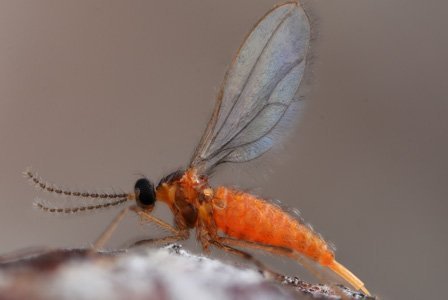 Die Douglasiengallmücken haben einen einjährigen Generationszyklus. Nach der Verpuppung im späten Frühling schlüpfen die orangen Gallmücken (3 – 5 mm, Abb. 2) mit dem Austrieb der Douglasien Anfang Mai. Die Eiablage erfolgt teilweise in die Knospen als auch auf den frisch gesprossenen Nadeln der Wirtsbäume. Die ausschlüpfenden Larven bohren sich anschliessend in die Nadeln ein und induzieren durch ihre Miniertätigkeit die charakteristische Gallbildung (Abb. 3).