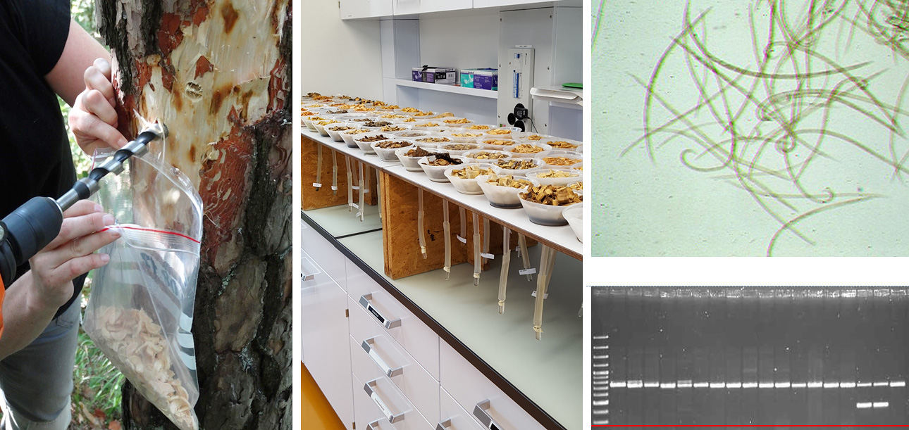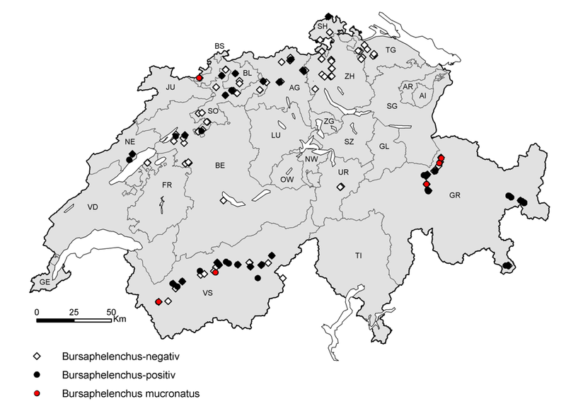 Seit 2010 führt die Eidgenössische Forschungsanstalt WSL jährlich Erhebungen zum Vorkommen des Kiefernholznematoden in allen wichtigen Föhrenbeständen der Schweiz durch (Abb. 4). Zudem überwachen die Forschenden Standorte mit einem erhöhten Risiko einer Einschleppung wie den Flughafen Zürich-Kloten, Rindenimport-Betriebe und Grosssägereien verstärkt. Fachpersonal entnimmt von frisch abgestorbenen Föhren mit einem Spiralbohrer Bohrproben aus dem Splintholz und untersucht die Holzspäne im Pflanzenschutzlabor auf Bursaphelenchus-Nematoden.