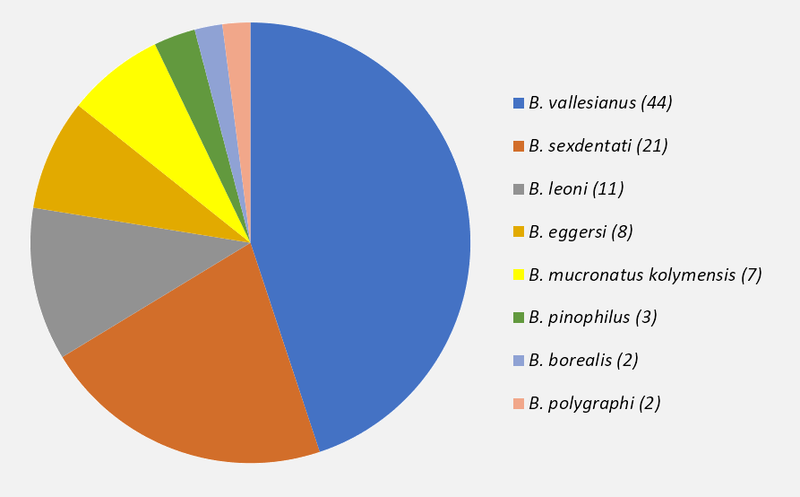 Die Forschenden stellten den Kiefernholznematoden bisher in keiner der untersuchten Holzproben fest. In zahlreichen frisch abgestorbenen Föhren wurden hingegen andere Bursaphelenchus-Arten gefunden und mittels DNA-Analysen identifiziert (Abb. 5). Die häufigste Art war B. vallesianus, gefolgt von B. sexdentati, B. leoni, B. eggersi und B. mucronatuskolymensis, drei weitere Arten, B. borealis, B. polygraphi und B. pinophilus, waren in den Proben sehr selten. Alle diese Arten kommen auch in anderen europäischen Ländern vor und gehören höchstwahrscheinlich zur einheimischen Nematodenfauna. Forschende der WSL beschrieben B. vallesianus weltweit zum ersten Mal in abgestorbenen Waldföhren im Wallis; daher erhielt diese Nematodenart ihren wissenschaftlichen Namen.