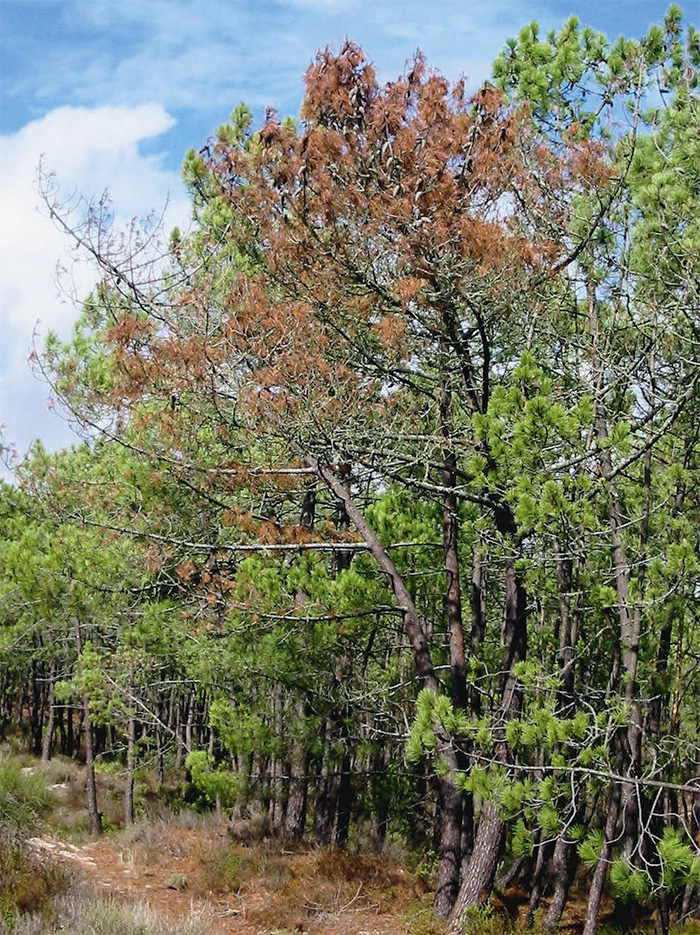 Erstes Zeichen einer Infektion durch den Kiefernholznematoden ist ein Rückgang der Harzproduktion. Die daraus resultierende rötlich-braune Nadelverfärbung breitet sich rasch vom Kronenbereich abwärts aus. Die Nadeln fallen nicht ab und der Baum trägt ein rötlich-braunes Nadelkleid (Abb. 3), was ein charakteristisches Merkmal dieser Welke darstellt. Bei optimalen Temperaturen für die Vermehrung des Kiefernholznematoden (d.h. Tagesdurchschnitt im Juli/August über 20 °C) stirbt der befallene Baum innerhalb von 2-3 Monaten ab. In kühlen und feuchten Sommern vermehren sich die Nematoden schlecht und der Befall verläuft ohne deutliche Symptome.