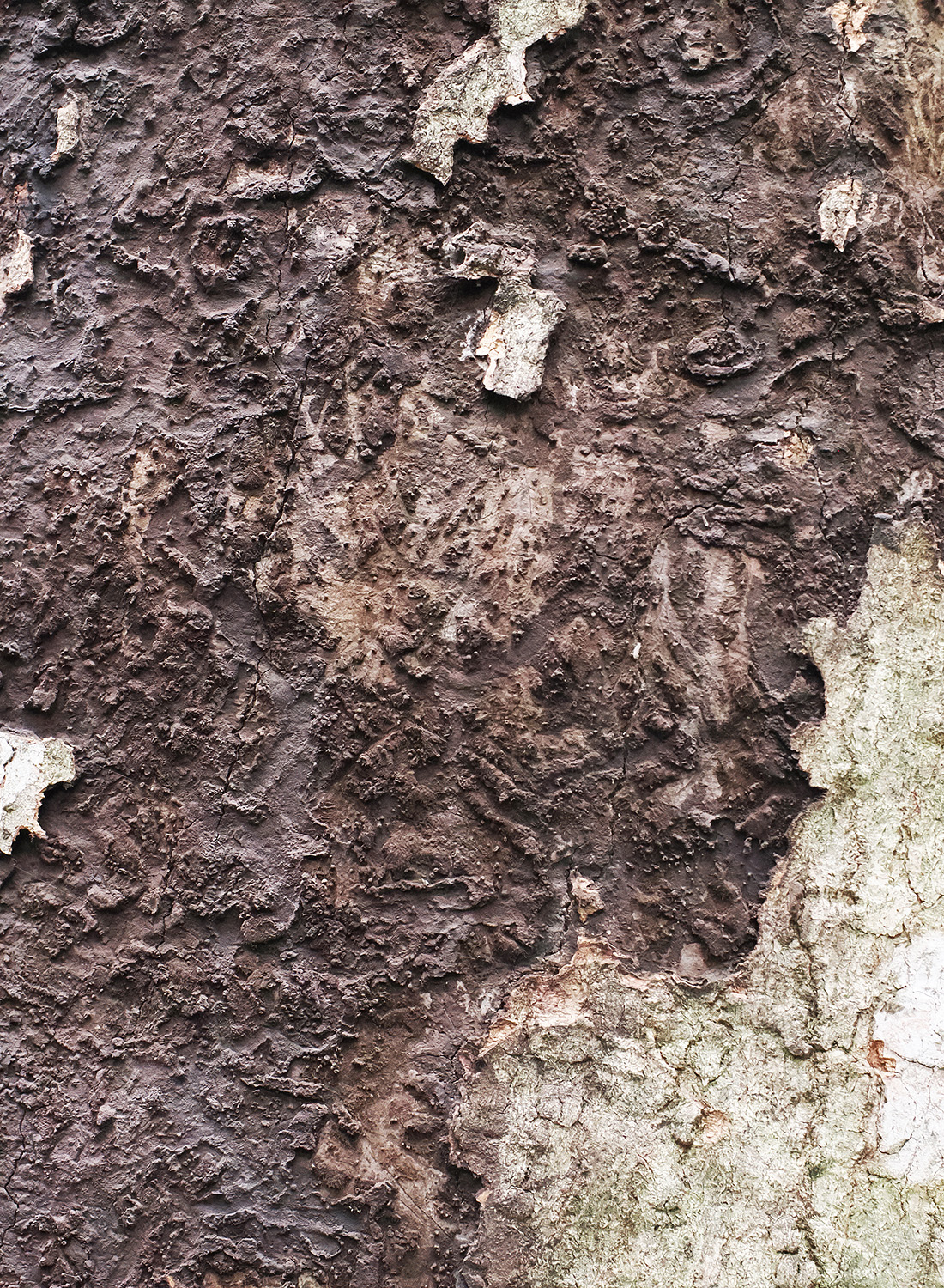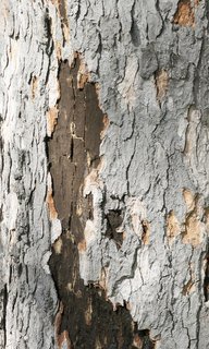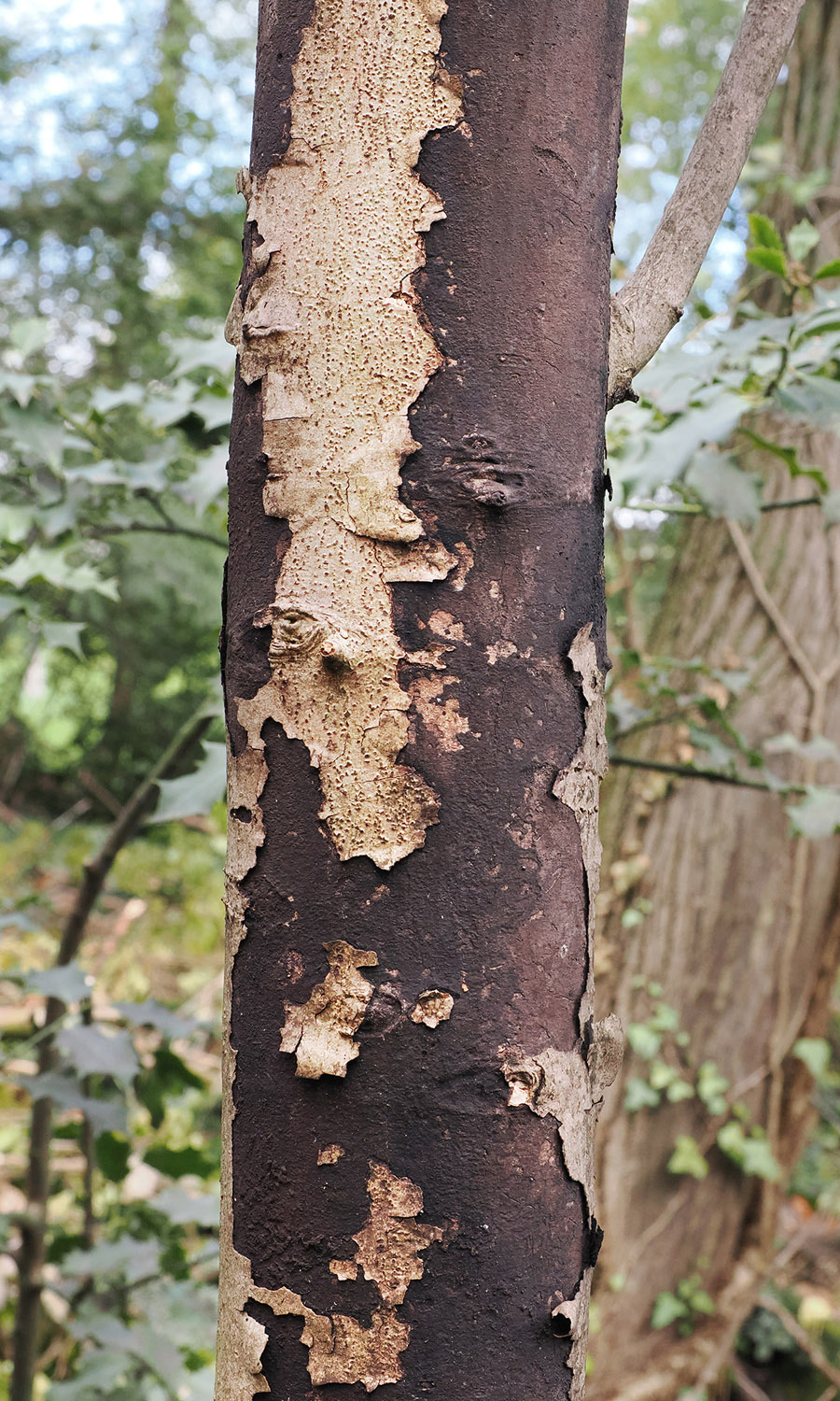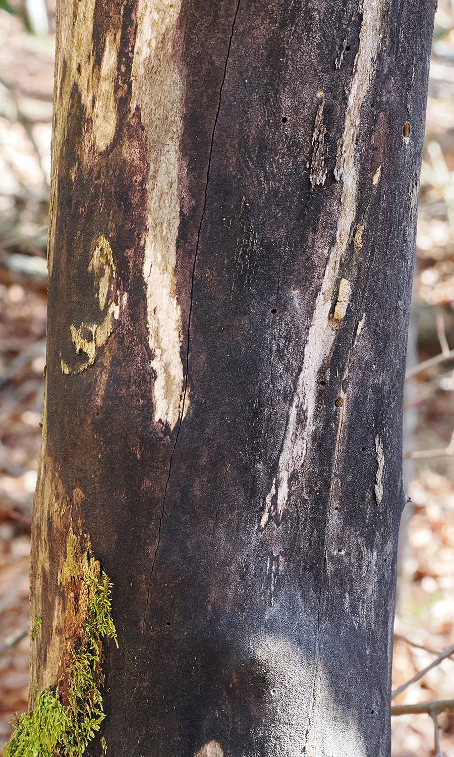 Abb. 5a: Russrindenkrankheit (Cryptostroma corticale) an Ahorn. Alter Befall mit bereits abgetragenem Sporenpulver. Die Oberfläche wirkt teilweise hart und glatt. Die schwarze Schicht ist unter der Rinde.