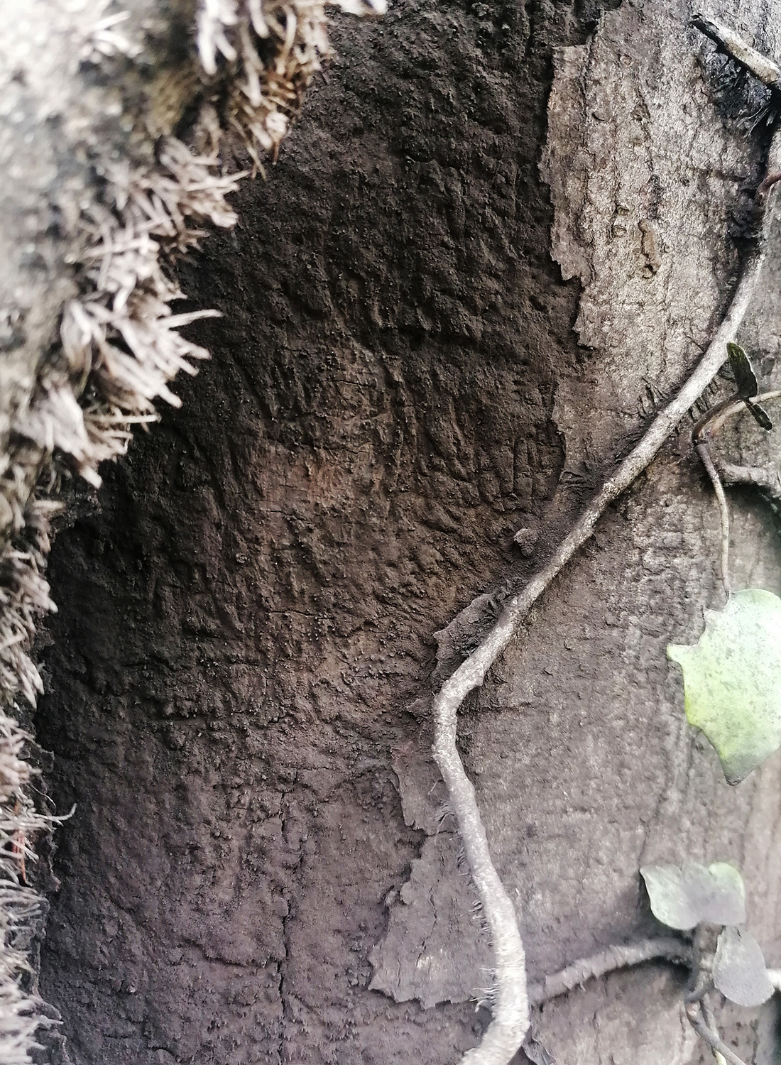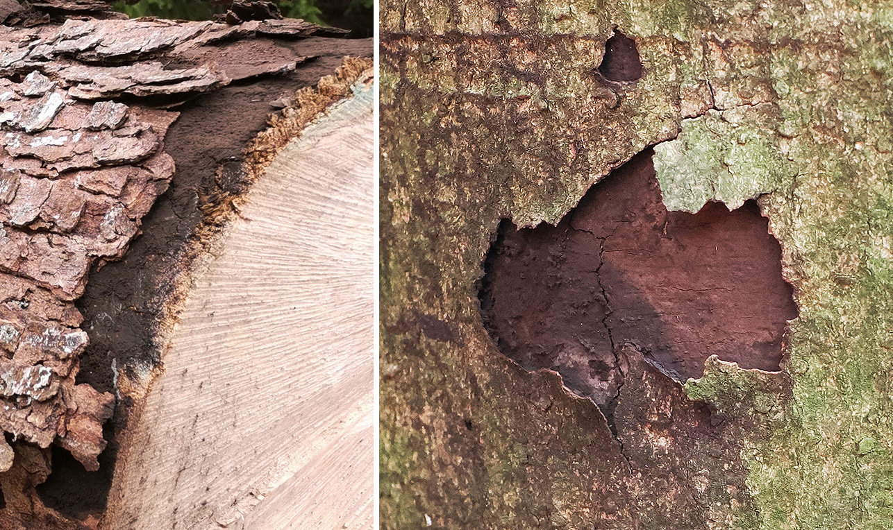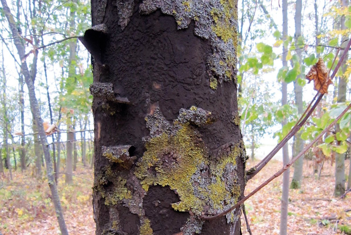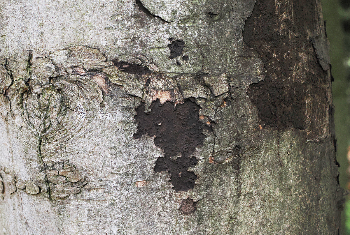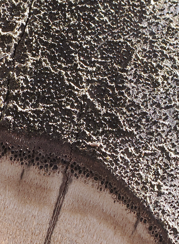 Abb. 6a: Russrindenkrankheit (Cryptostroma corticale) an Ahorn. Oberfläche pulverig. Relativ frisch freigelegte Sporenschicht. Es hat viel schwarzes Pulver, das vom Wind auf darunterliegende Stammbereiche und umliegende Vegetation vertragen wird – diese erscheint dadurch «russig».
