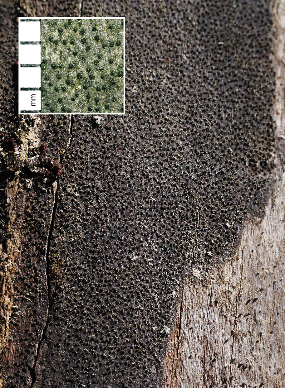 - Ebenfalls auf Ahorn kommt häufig der Ahorn-Kohlenkrustenpilz (Eutypa maura, syn. E. acharii, Abb. 4b, 5c, 6c, 7c) auf bereits abgestorbenen, entrindeten Ästen und Stämmen vor. Auch dieser Pilz verursacht eine grossflächige schwarze Verfärbung des Holzes, die aber nie durch Sporen staubig ist. Vielmehr ist die glatte Oberfläche durch zahlreiche Einzelfruchtkörper punktiert. Die herausragenden Noppen (Ostiolen) lassen sich durch Berühren gut ertasten. Bei Befällen von Russrindenkrankheit fehlt diese Punktierung.