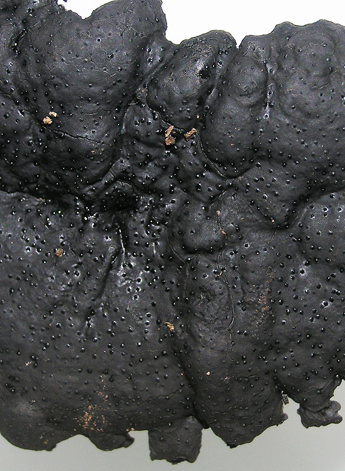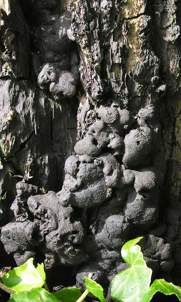Abb. 5b: Brandkrustenpilz (Kretzschmaria deusta) an Ahorn. Harte, stark gewölbte Kruste mit unregelmässigen Rändern. Die schwarze Kruste sitzt auf der Rinde auf.