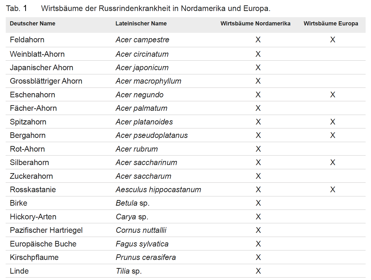 Die Russrindenkrankheit trat seit den Hitzejahren 2015 sowie 2018/2019 vermehrt in der Schweiz auf – stets an Ahorn. Im Jahr 2023 wurde sie dann in der Schweiz zum ersten Mal an Rosskastanie (Aesculus hippocastanum) gefunden. Die Symptome glichen denen an Ahorn. Unter der aufgeplatzten Rinde hatte sich ein schwarzes Stroma entwickelt, das in grossen Mengen feinen, dunkelbraunen Konidienstaub bildete. Nicht zuletzt aufgrund des Gesundheitsrisikos für Menschen – der Konidienstaub kann Atemwegserkrankungen und allergische Reaktionen auslösen – ist es wichtig, neben dem Ahorn jetzt auch die Rosskastanie im Auge zu behalten. Es sollen aber auch weitere, nicht verwandte Arten wie Birken und Linden an der Russrindenkrankheit erkranken können (siehe Tab. 1).