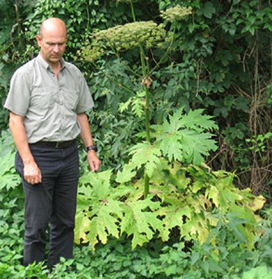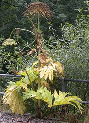 Der Riesen-Bärenklau (auch Herkules-Staude genannt) stammt ursprünglich aus dem Kaukasus, seit 1950 breitet er sich ausgehend von den heimischen Gärten auch im Wald, an Gräben, Wegrainen, Uferbereichen und Flussniederungen aus.