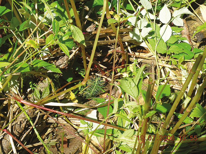 Abb. 2: An zwei Versuchsstandorten untersucht die LWF die Auswirkungen des Indischen Springkrauts auf die Waldverjüngung. Im Bild ein Fichtenkeimling im 2. Jahr unter einem dichten Schirm von Springkraut (Foto: C. Ammer).