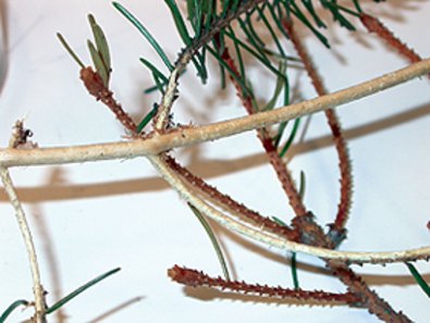 Abb. 5: Reifungsfraß von Monochamus sartor: am Ende der Lebendzeit waren die Picea abies-Zweige vollständig entrindet