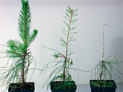 Abb. 4: Reifungsfraß von Monochamus galloprovincialis pistor an Pinus sylvestris-Sämlingen (links: kein Reifungsfraß, Mitte: 1 Woche Reifungsfraß, rechts: 2 Wochen Reifungsfraß)