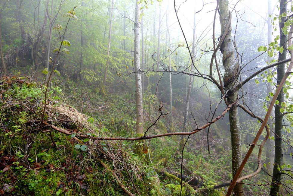 Abb. 1 - Im Kanton Nidwalden auf einer Lotharfläche an Bergahornen hochrankende Kiwipflanze. Foto: Oswald Odermatt (WSL)
