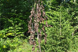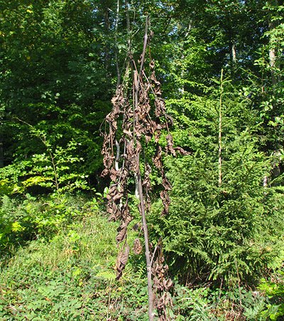 Dies trifft möglicherweise für die sich gegenwärtig ausbreitende Eschenwelke zu (Abb. 5). Der verursachende Pilz war über Jahrzehnte, wahrscheinlich sogar noch viel länger, ein unauffälliger einheimischer Blattbewohner. Zusammen mit einer neuen, aggressiven Schwesterart befällt der Pilz nun Eschen in weiten Teilen Europas. Seit 2008 verursacht er auch in der Schweiz massive Welke- und Absterbeerscheinungen. Die Dothistroma-Nadelbräune als weiteres Beispiel ist wahrscheinlich einheimisch. Der Nadelpilz wurde in der Schweiz erstmals 1989 entdeckt und wird seither immer öfter an Bergföhren in Gärten festgestellt. In Kanada hat der Pilz bewiesen, dass er sich auch bei geringen klimatischen Veränderungen zu einem erheblich gefährlicheren Schadorganismus wandeln kann.