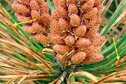 Abb. 4 - Die Braunfleckenkrankheit der Föhre wird durch den Nadelpilz Lecanosticta acicola verursacht. Der aus Zentralamerika stammende Pilz gilt in Europa als Quarantäneorganismus und muss bekämpft werden. Foto: Waldschutz Schweiz (WSL)