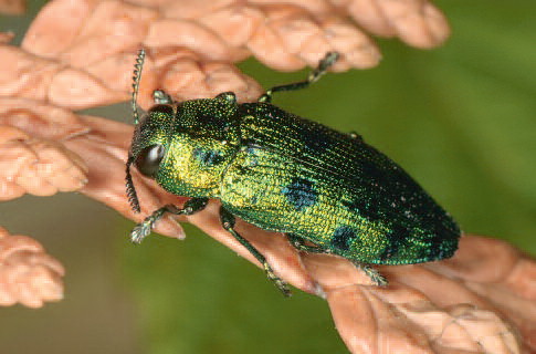 Abb. 6 - Der Grüne Wacholderprachtkäfer befiel bisher in Mitteleuropa nur Wacholder. Seit neustem hat er auch Thuja in seinen Speiseplan aufgenommen. Foto: Beat Wermelinger (WSL)