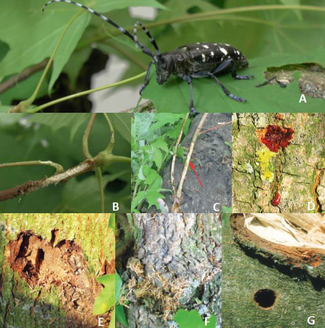 A Asiatischer Laubholzbockkäfer B Reifungsfrag des Käfers an Blattstielen und C Zweigen, D Eitrichter mit Saftfluss, E Einbohrloch, F Nagespäne, G kreisrundes Ausbohrloch (A+B: Zimmermann, LTZ; C- G: Schröder, JKI)