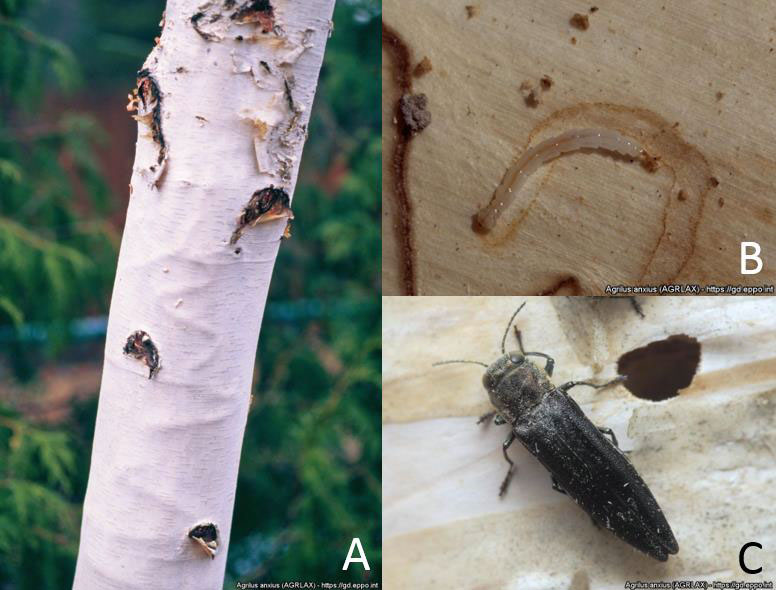 A Unter der Rinde hervor wölbende Larvengänge, B Larve des Bronzefarbenen Birken-Bohrers, C frisch geschlüpfter Bronzefarbener Birken-Bohrer (Länge ca. 0,5-1,3 cm) neben dem typischen D-förmigen Ausbohrloch. Bilder bereitgestellt von Eppo (https://gd.eppo.int).