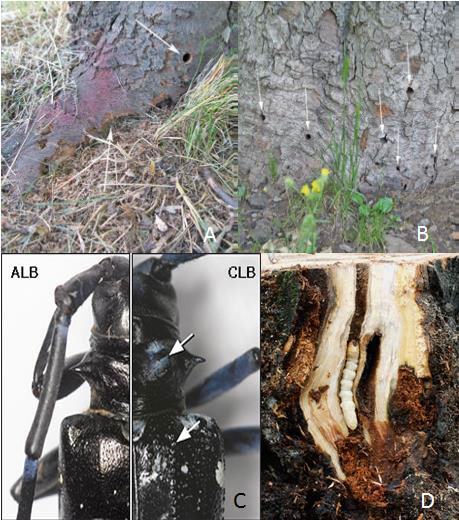 A+B Larvenaktivität und Ausbohrlöcher am Stammfuß (Schröder, JKI), C Unterschied ALB und CLB (Wermelinger, WSL), D Larve des CLBs (WSL)