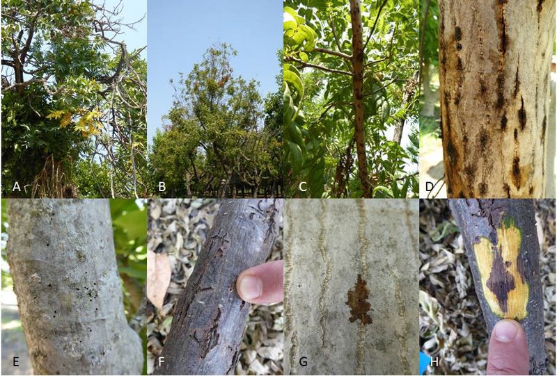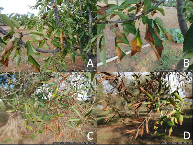A + B Durch das Feuerbakterium verursachtes Absterben und bronzeartige Verfärbung an Kirsche und Olive C + D. Bilder bereitgestellt von Eppo (https://gd.eppo.int).