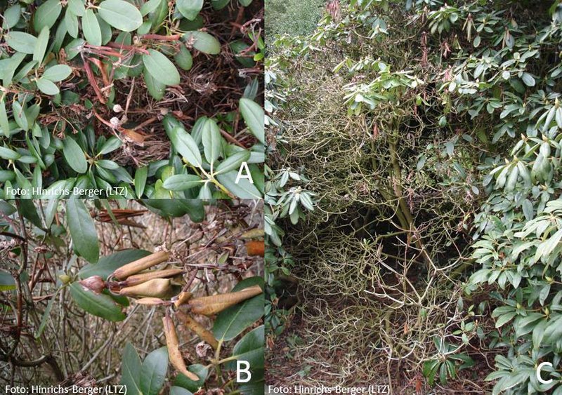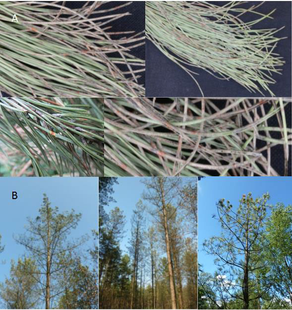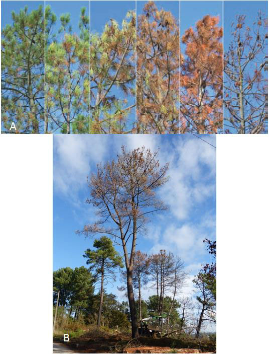 A Verlauf der Schadsymptome von gesund bis abgestorben an Pinus pinaster (Schröder, JKI), B befallene Kiefer (Mühleisen, LTZ)