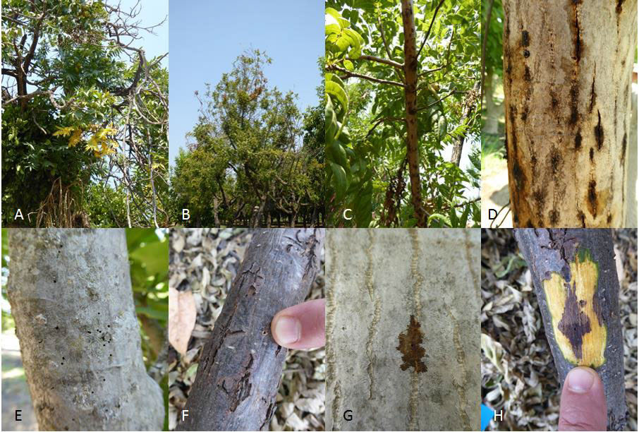 - Larvenfraß: bei Platzfraß am Kambium bilden sich Rindennekrosen mit Saftfluss (Abb. D), Überwallung des Platzfraßes