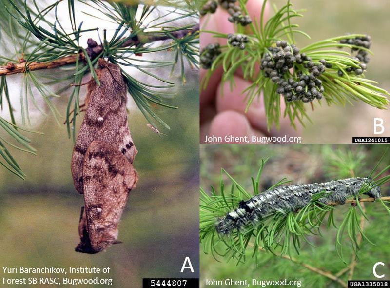 A Männlicher und weiblicher Falter der Sibirischen Seidenmotte bei der Paarung, B an Nadeln abgelegte Eier, C Raupe der Sibirischen Seidenmotte. Bilder bereitgestellt von Bugwood.org (www.bugwood.org).