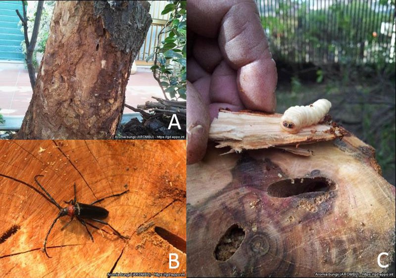 A Abgestorbener Baum nach Befall des asiatischen Moschusbockkäfers, B asiatischer Moschusbockkäfer (Länge ca. 2,5-4 cm), C Larve des asiatischen Moschusbockkäfers mit Larvengängen im Splintholz. Bilder bereitgestellt von Eppo (https://gd.eppo.int).