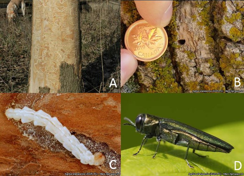 A Im Kambialbereich serpentinenartige Larvengänge, B für Agrilus-Arten typisches D-förmiges Ausbohrloch, C Larve des Eschenprachtkäfers, D Ausgewachsener Eschenprachtkäfer (Länge ca. 0,8-1,5 cm, Breite 0,3-0,35 cm). Bilder bereitgestellt von Eppo (https://gd.eppo.int).