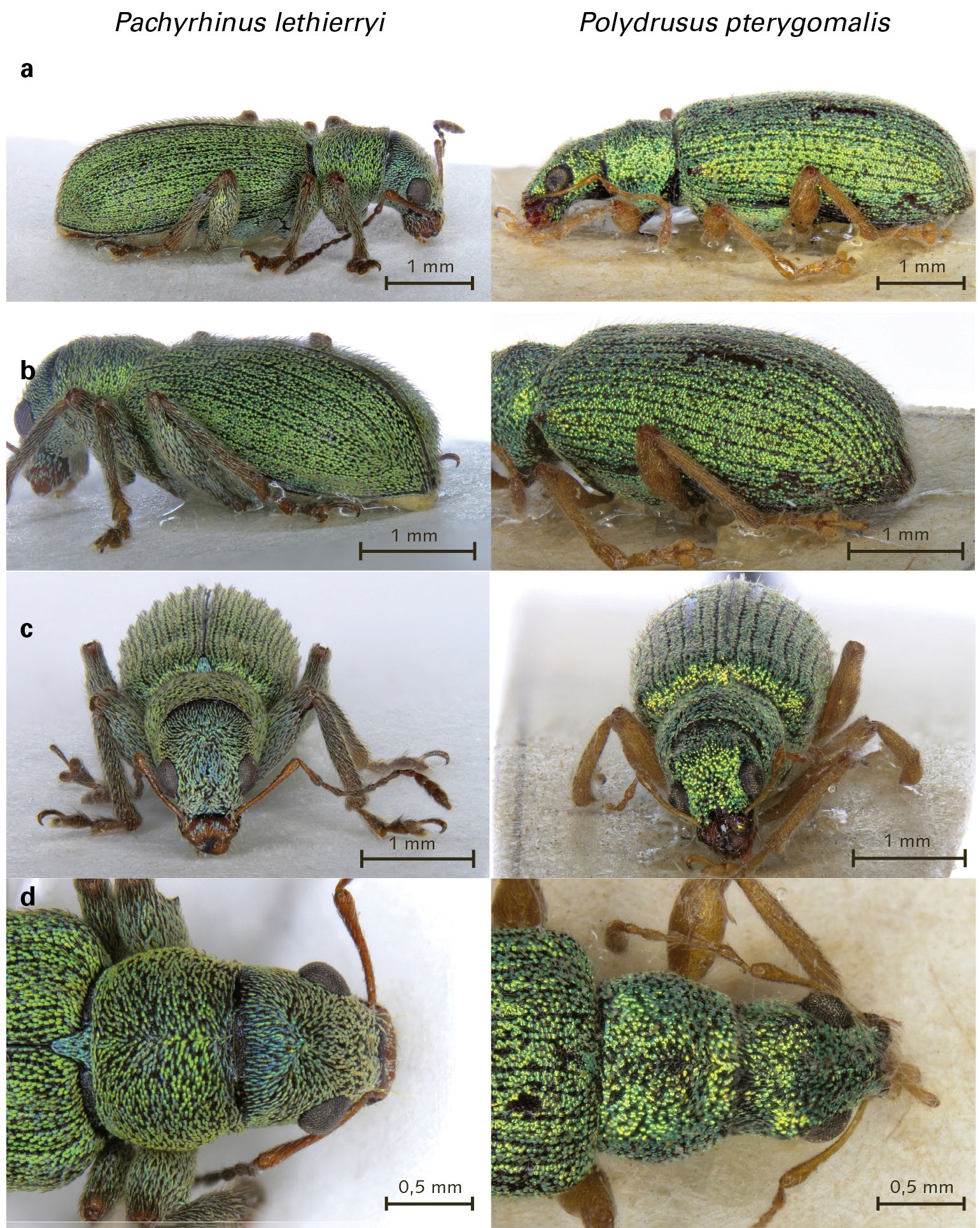 Zur Trennung der Gattungen Polydrusus und Pachyrhinus kann festgehalten werden, dass der Rüssel von Pachyrhinus spp. kürzer ist als breit und am Vorderende eine geglättete Platte, teils mit wenigen Schuppen besetzt (Abbildung 3a), aufweist, welche bei P. lethierryi durch eine Querleiste (Querdepression in Rheinheimer, 2003) vom beschuppten Rüssel getrennt ist. Im Gegensatz dazu ist der Rüssel von Polydrusus spp. meist etwa so breit wie lang und ohne abgegrenzte geglättete Fläche (Abbildung 3b).