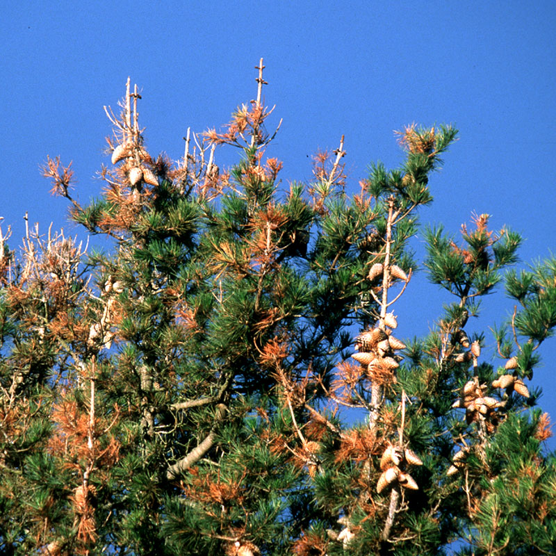 Fusarium circinatum ist einer der wenigen Pilze, die mit dem Saatgut verbreitet werden können. Am Saatgut selbst sind keine Symptome zu erkennen. Sämlinge zeigen Symptome der Umfallkrankheit, an älteren Bäumen kommt es zu Triebsterben und starkem Harzfluss. Typisch sind kahle Triebe, die aus der sonst grünen Krone herausragen (Abb. 1). Im Bestand verbreiten verschiedene Insekten den Pilz.