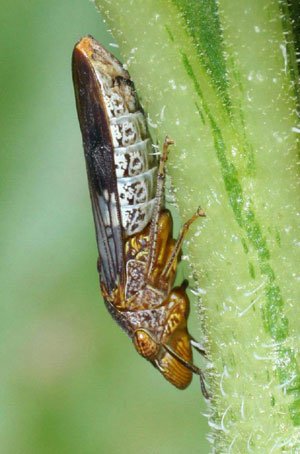 Homalodisca vitripennis, eine Zwergzikade, die beim Saugen von Pflanzensäften das Bakterium in das Xylem der Pflanze übertragen kann. (Foto: Russ Ottens, University of Georgia / © Bugwood.org. Lizenziert unter CC BY 3.0 us über Wikimedia Commons)
