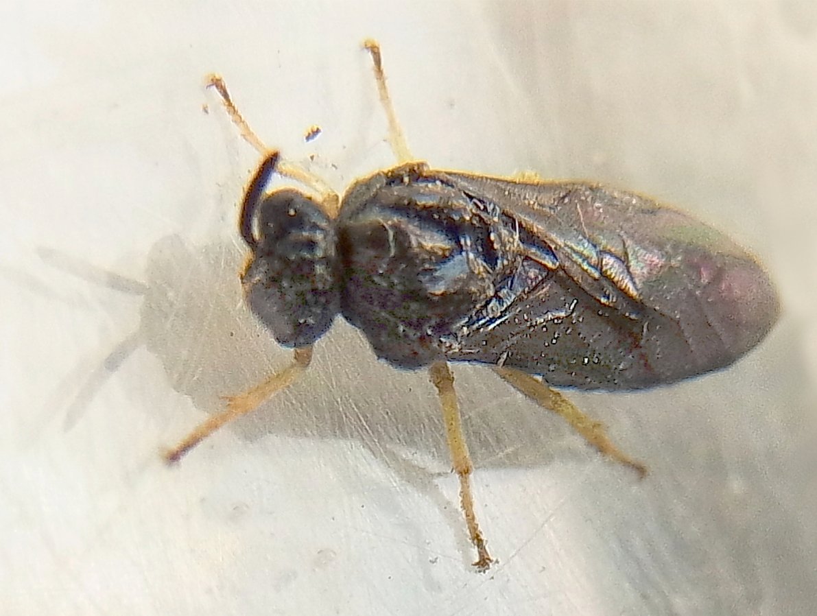 Das 6-10 mm grosse adulte Weibchen besitzt dreigliedrige Fühler und ist bräunlich bis schwarz gefärbt mit bräunlich durchscheinenden Flügeln und hellen Beinen. Männchen dieser Art sind nicht bekannt.