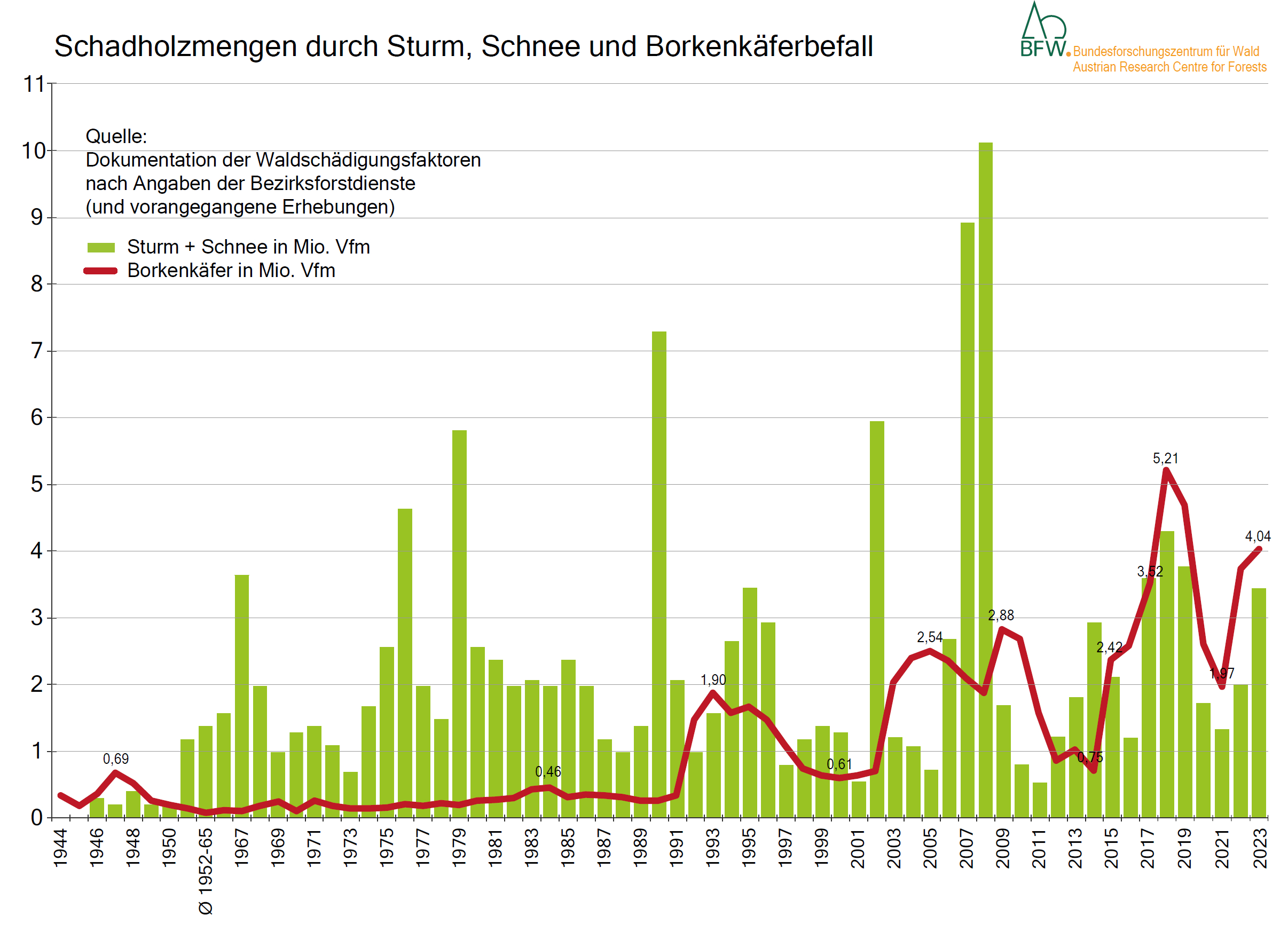 Für den Überblick über die Forstschutzsituation im gesamten Bundesgebiet und die Entwicklung zum Vorjahr sind die Ergebnisse in Form von Österreich-Karten dargestellt, die in einem Sonderheft der Fachzeitschrift "Forstschutz Aktuell" veröffentlicht werden.