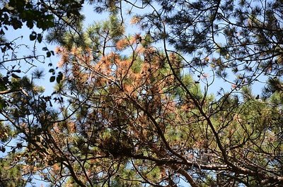 Die Weißkiefer stirbt in den letzten Jahren im Wald- und Weinviertel vermehrt nestweise ab. Fast immer sind Borkenkäfer beteiligt: Typischerweise ist es der Sechszähnige Kiefernborkenkäfer, der im Kronenbereich den Befall beginnt, oft bald gefolgt vom Zwölfzähnigen Kiefernborkenkäfer. Aufgrund der geringeren Größe des ersteren und dem weniger auffälligen Bohrmehlauswurf wird der Befall manchmal übersehen. Es sind allerdings in der angespannten Situation Forstschutzmaßnahmen angeraten, d.h. befallene Kiefern sollten rechtzeitig vor Abschluss der Brutentwicklung aus dem Wald gebracht werden.