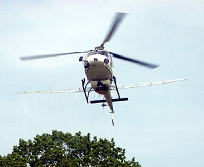 Abb. 2: Ausbringung eines Bt-Präparates mit dem Helikopter. (Foto FVA/H. Delb)