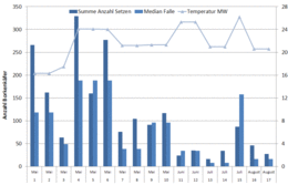 Gemessen anhand der Zahl der gefangenen bzw. getöteten Buchdrucker-Individuen unterscheiden sich TriNet® und die Borkenkäferfallen nicht in ihrer Effektivität, wenn davon ausgegangen wird, dass alle Buchdrucker mit Netzkontakt eine letale Wirkstoffdosis aufnehmen. Denn zwischen der Anzahl von Buchdruckern, die sich auf das Netz setzten und Buchdruckern, die in derselben Zeit in der Falle gefangen wurden (Median aus drei Fallen), kann kein signifikanter Unterschied festgestellt werden (t: 0,287) (Abb. 8).