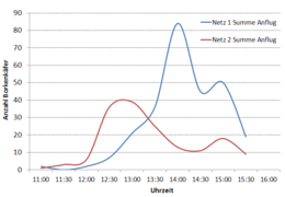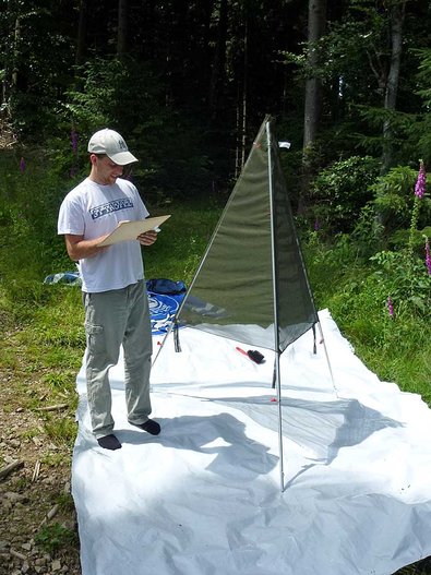 Gestänge und Netz wurden im Zeitraum vom 8.5. bis 9.8.2012 täglich neu auf einem Maschinenweg am Bestandesrand aufgestellt (Abb. 1). In der Auswertung werden nur trocken-warmen Tage (Sonnenschein und Temperaturen über 18 ° C, N=17 d) und Zeiten mit idealen Flugbedingungen (von 11 bis 15.30 Uhr) berücksichtigt.