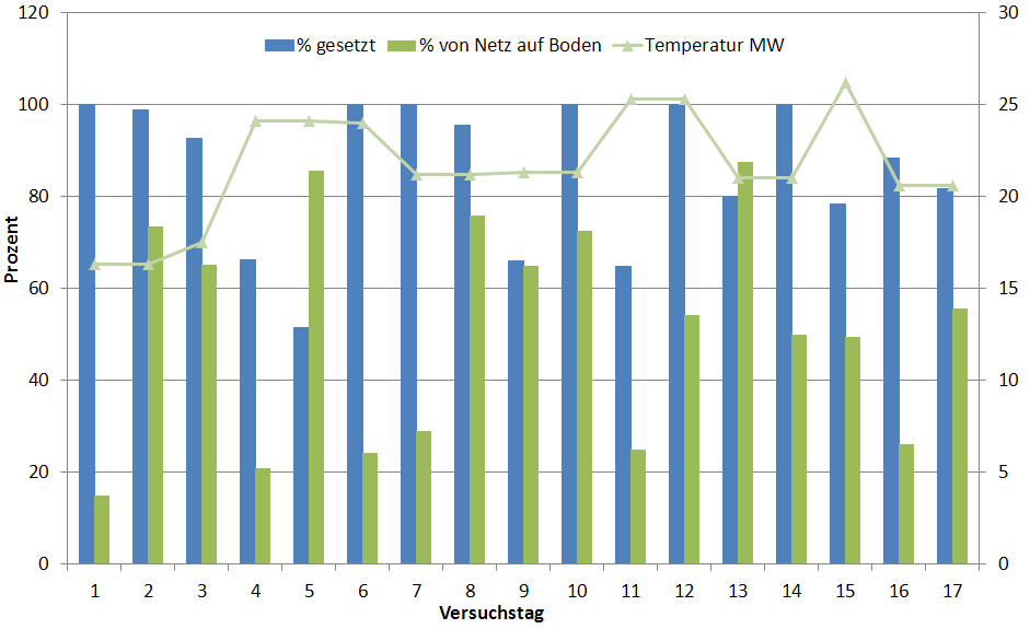 82 % der anfliegenden Buchdrucker setzte sich auf das TriNet®. Die Anflüge korrelierten positiv mit der Lufttemperatur und es gab einen deutlichen Positionseffekt, denn besonnte Netze wurden deutlich stärker angeflogen als Netze, die im Schatten standen (Abb. 6). Ein Großteil der Buchdrucker saß mehrere Minuten, einige bis hin zu Stunden (!) auf dem Netz. 44 % der auf dem Netz sitzenden Buchdrucker fielen im Lauf des Versuchs tot zu Boden (Abb. 7).