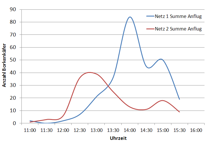 Es wurden drei Netze untersucht (von der BASF zur Verfügung gestellt) und je eines von einem Beobachter kontrolliert (Abb. 2): In einem Intervall von fünf Minuten wurde die Anzahl der Buchdrucker notiert, die in dieser Zeit auf das Netz zuflog, sich auf das Netz setzte (Abb. 3) und wieder wegflog, sowie die Anzahl der Käfer, die tot bzw. regungslos auf den Boden fielen. Um die Käfer am Boden gut erkennen zu können, wurde beim Versuchsaufbau eine weiße Folie unter das Netz-System gelegt. Zusätzlich wurden Nicht-Ziel-Organismen registriert, die auf dem Netz beobachtet wurden. Zudem wurden die Fänge der im Gebiet stehenden Theyson-Schlitzfallen, die mit Pheroprax® beködert waren, für denselben Zeitraum ermittelt (Leerung bei Start, Auszählen zum Versuchsende).