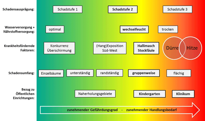 Die grundsätzliche Entscheidungshilfe für den Handlungsbedarf im Umgang bei einer potenziellen Gefährdung durch die Ahorn-Rußrindenkrankheit richtet sich nach mehreren zu beachtenden Kriterien (Abb. 9).