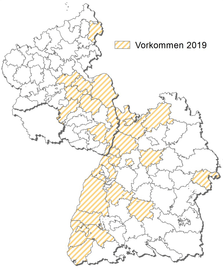 Abb. 6: Nachweise in Südwestdeutschland und eine grobe Verteilung der Ahorn-Rußrindenkrankheit auf Basis von Meldungen zum Schadpathogen.