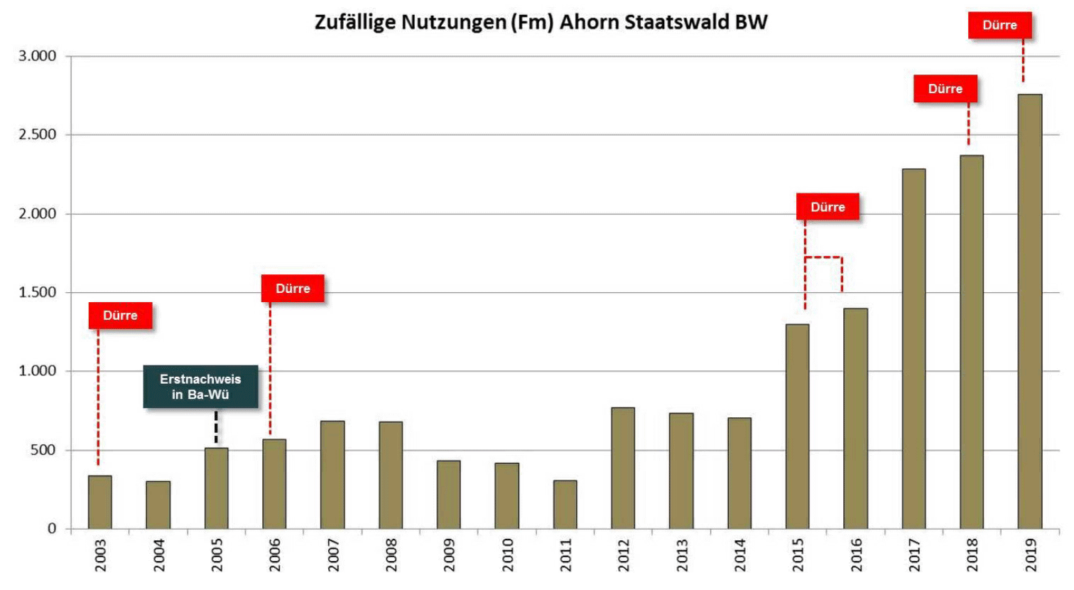 Mit dem Bergahorn ist eine wichtige Mischbaumart mit einer weiten Verbreitung betroffen. Besonders 2018 und 2019 sind in Südwestdeutschland vielerorts hohe Niederschlagsdefizite zusammen mit hohen Temperatursummen aufgetreten, die der Krankheit einen Vorschub geleistet haben (Abb. 7).