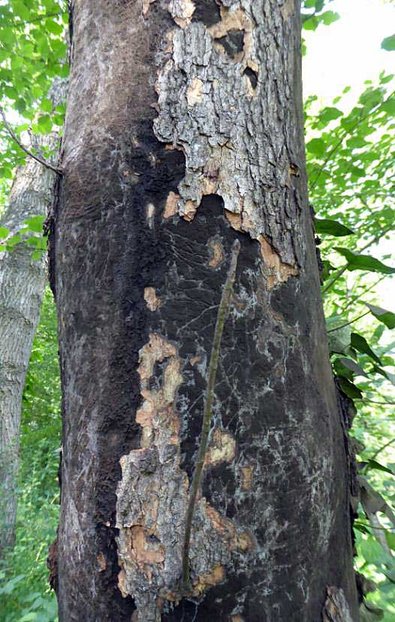 Abb. 4: Älterer Bergahorn mit ausgebildeter Borke und freigelegten Sporenlagern von C. cryptostroma.