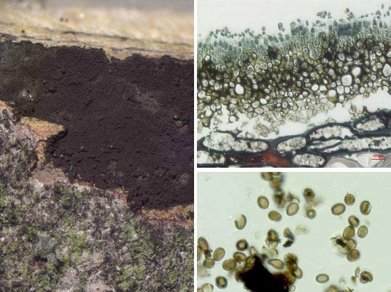 Im Uhrzeigersinn: Abb. 1: Schwärzlichbraunes freiliegendes Sporenlager von C. corticale in der Rinde. Abb. 2: Sporenbildende Schicht (Phialiden) von C. corticale mit Sporen (Pfeil) in der äußeren Rinde von Bergahorn (Querschnitt). Abb. 3: Pigmentierte ovale Sporen von C. corticale (5x4 µm).