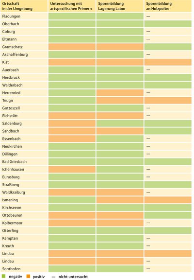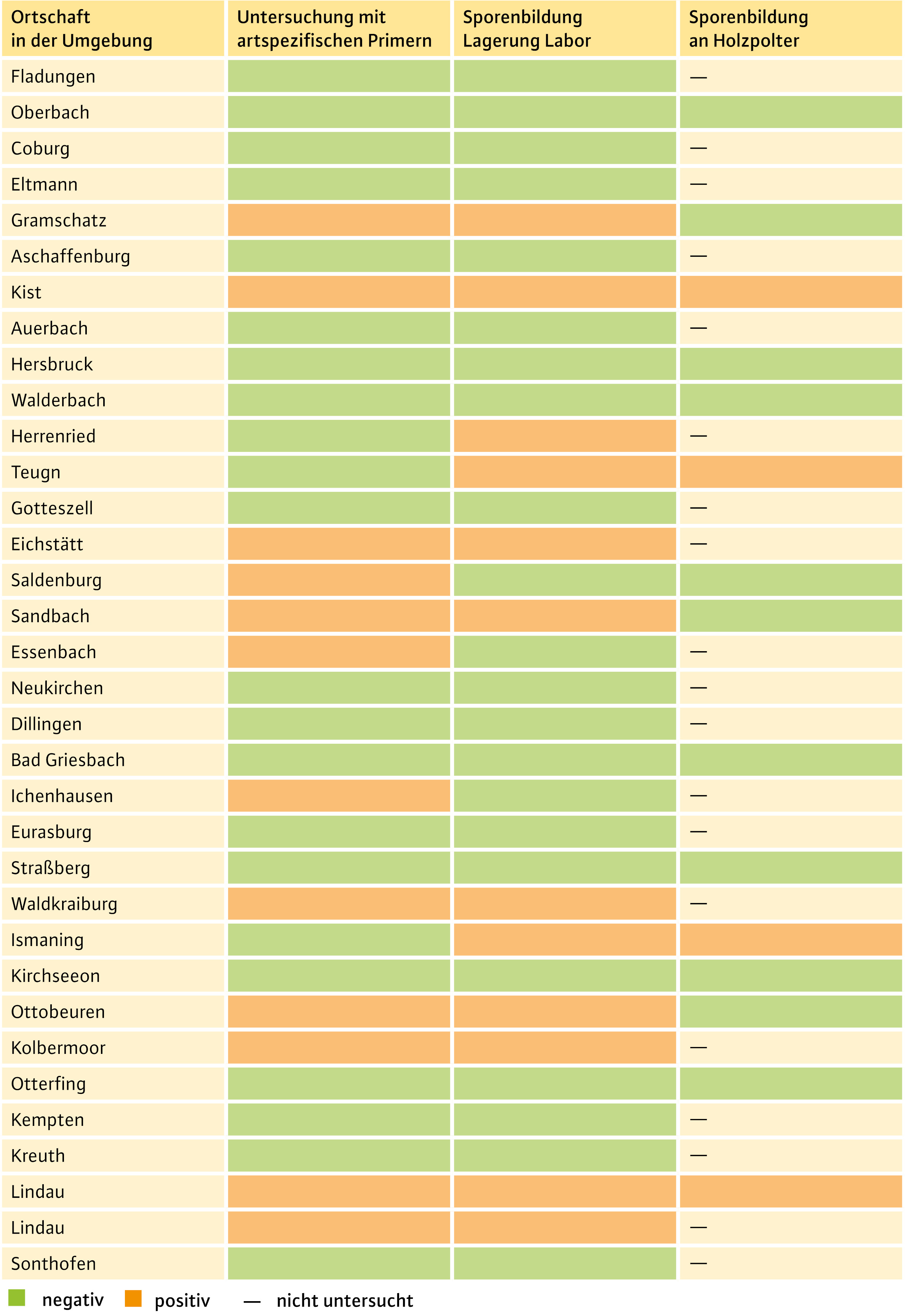 Insgesamt konnte in knapp der Hälfte der untersuchten Bestände (15 von 34) anhand der drei Nachweisverfahren der Erreger der Rußrindenkrankheit endophytisch nachgewiesen werden (Abbildungen 3 und 4). Zwischen den Ergebnissen des Nachweises durch die PCR mit artspezifischen Primern, der Inkubation von Rundlingen in Klimaschränken sowie der Lagerung von Holzpoltern gab es in jeweils über 80 % der Fälle Übereinstimmungen.