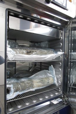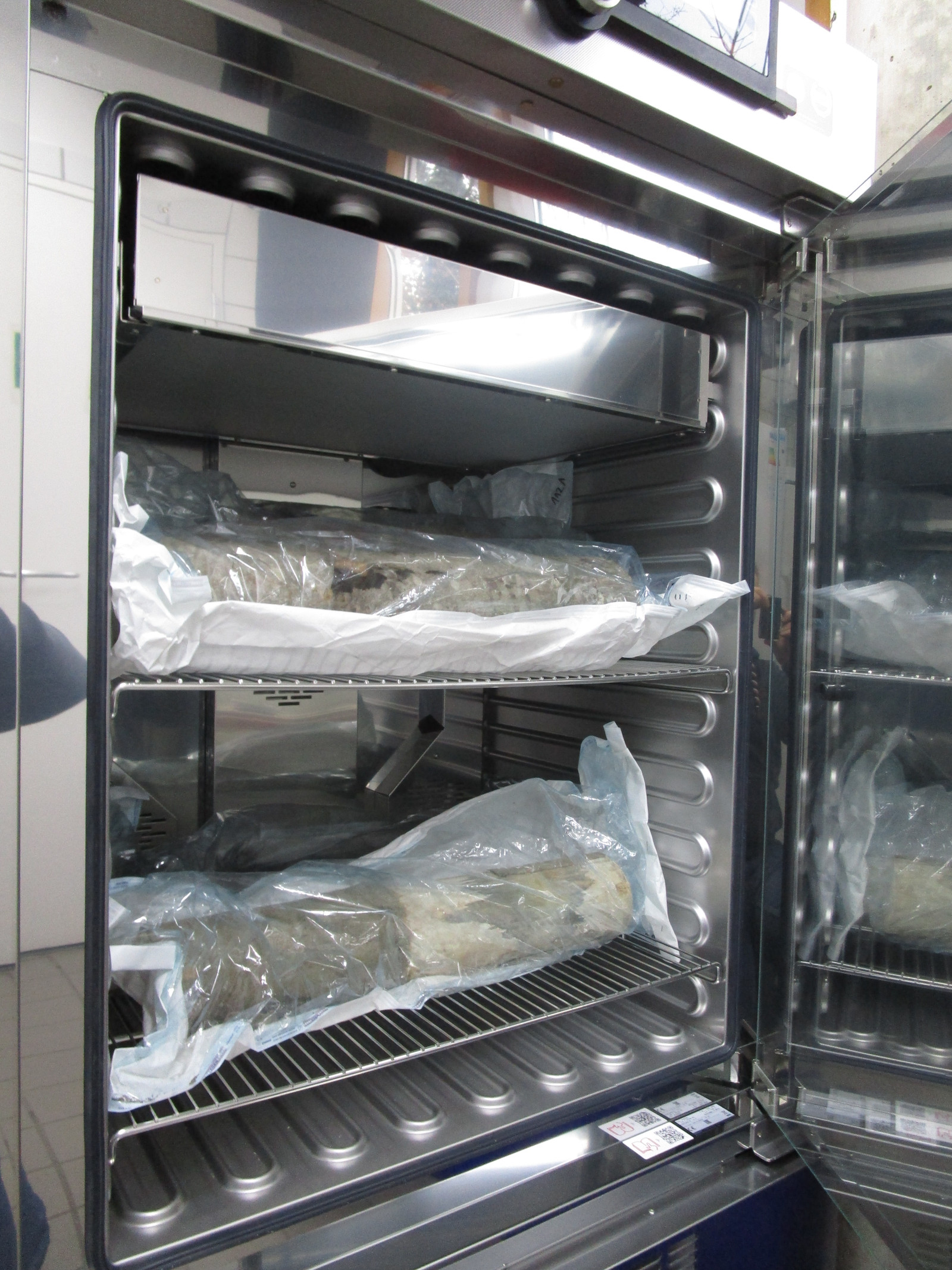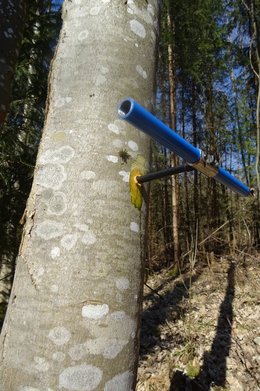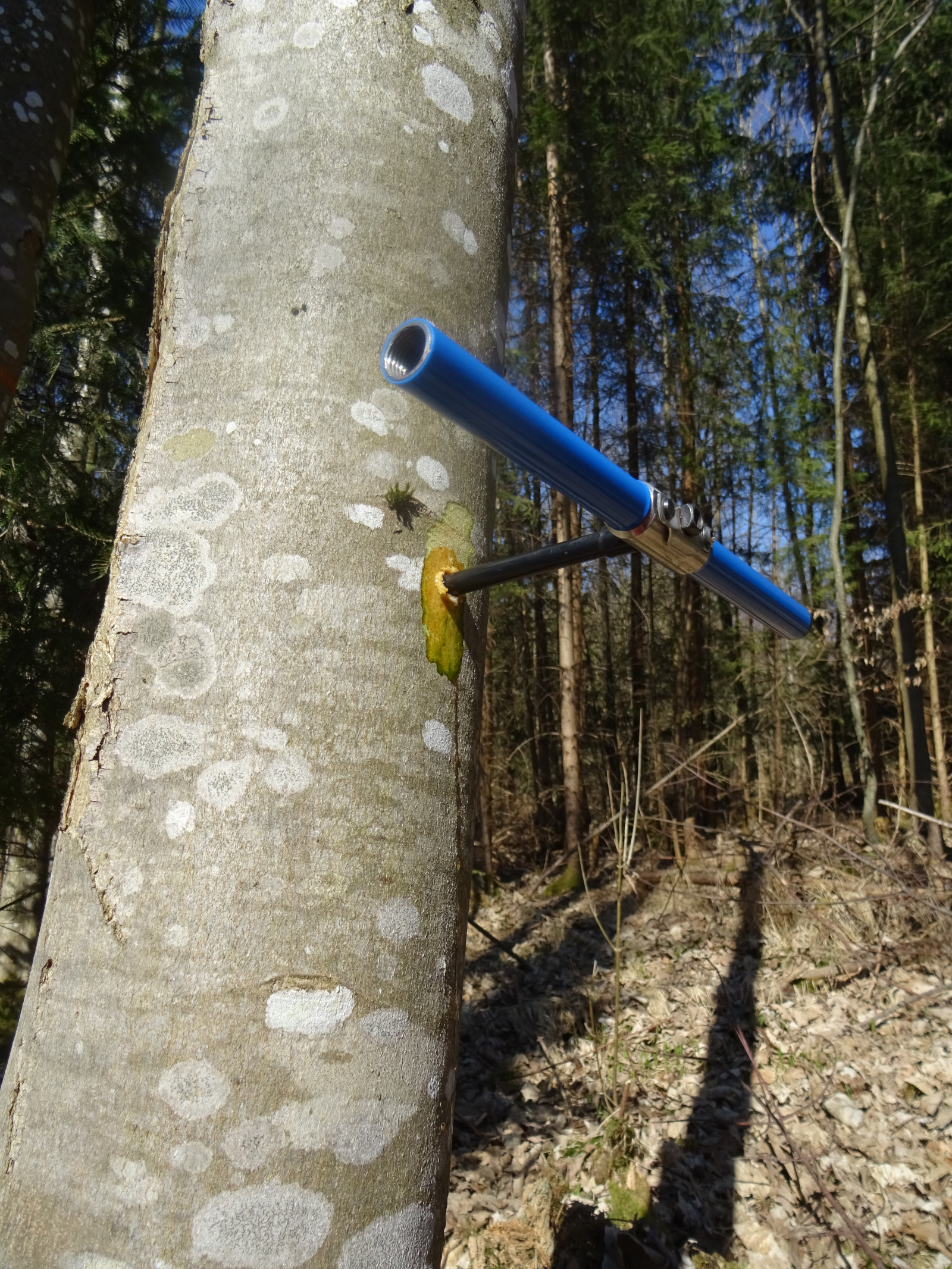 Von je einem Bergahorn der 34 Bestände wurde ein 50 cm langer Rundling aus dem unteren Stammbereich entnommen und im Labor in eine wasserdampfdurchlässige, aber sporendichte Verpackung eingeschlossen (Abbildung 2b). Die Stammabschnitte wurden über Monate in Klimaschränken bei 25 °C auf etwa 30 % Holzfeuchte getrocknet, um eine mögliche Sporenbildung durch den Erreger der Rußrindenkrankheit zu induzieren.