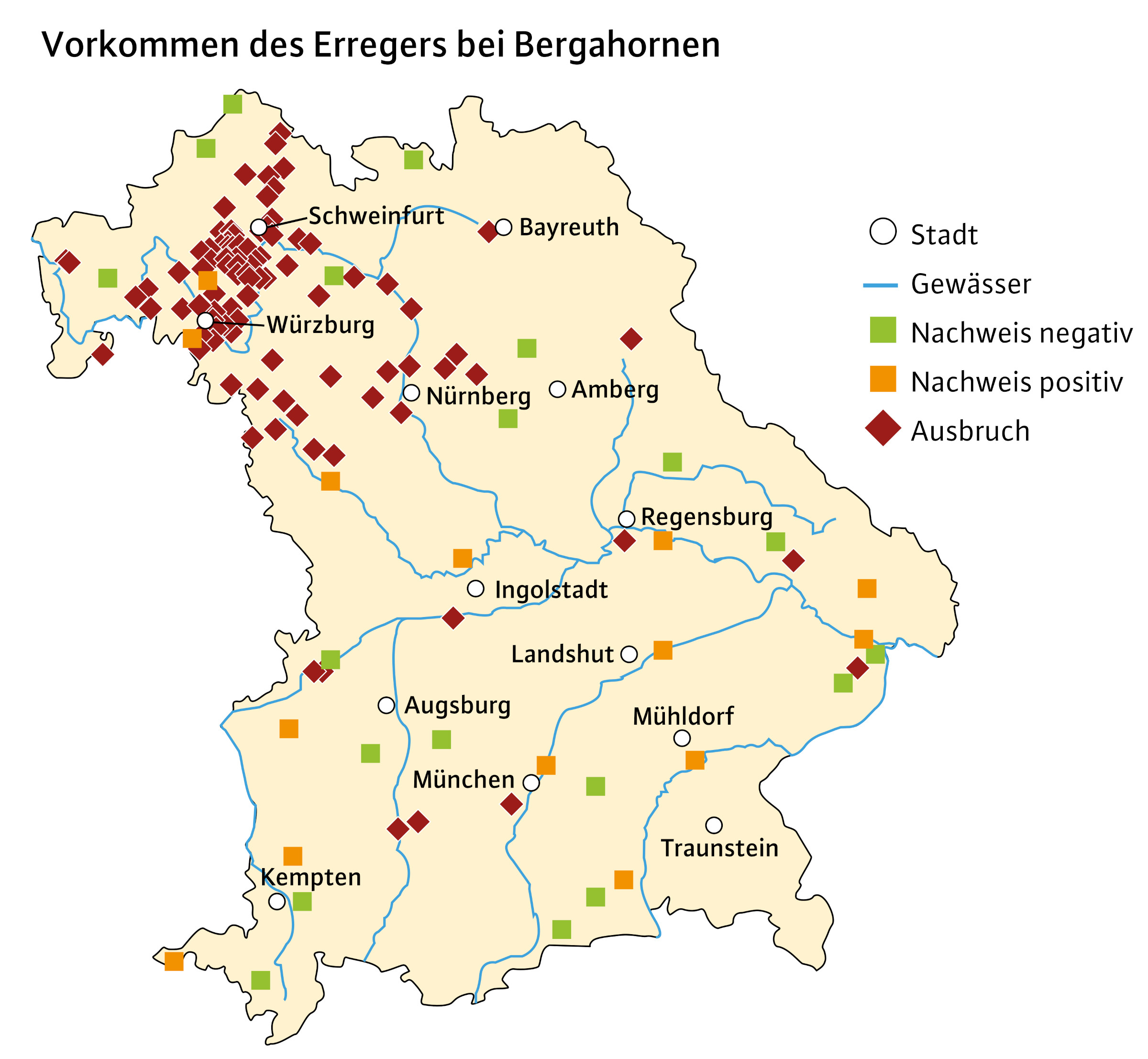 Die Nachweise gelangen dabei nicht nur in Unterfranken im Raum Würzburg, in dem die Rußrindenkrankheit in zahlreichen Bergahorn-Beständen bereits beobachtet werden konnte. C. corticale konnte auch in Beständen im Alpenvorland Bayerns und den Ausläufern des Bayerischen Waldes nachgewiesen werden. Im Gegensatz dazu konnte C. corticale in manchen Beständen mit räumlicher Nähe zum Raum Würzburg nicht nachgewiesen werden.