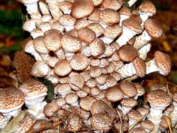 Abb. 2: Hallimasch-Fruchtkörper an der Stammbasis eines jungen Laubbaumes (Foto: P. Heydeck).