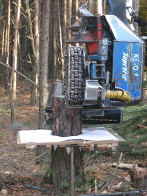 Eine eigens entwickelte Sprühbildkonstruktion dokumentierte das Applikationsverhalten des Harvesters. Hiermit konnten die notwendige Deckung auf der Stubbenoberfläche überprüft und seitliche Verluste der Pilzlösung aufgezeigt werden (Abbildung 1). Durch Veränderung von Druck, Sprühbeginn und -ende an der Steuereinheit verringerten sich schrittweise die Ausbringungsverluste. Eine möglichst vollständige Applikationsdeckung am Stubben wurde angestrebt. Zwei optimierte Einstellungen in Abhängigkeit des Baumdurchmessers wurden herausgearbeitet. Im weiteren Untersuchungsprogramm erfolgte die Verbrauchsermittlung der Pilzlösung unter Praxisbedingungen (Abb. 2).